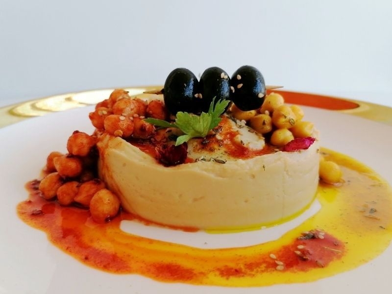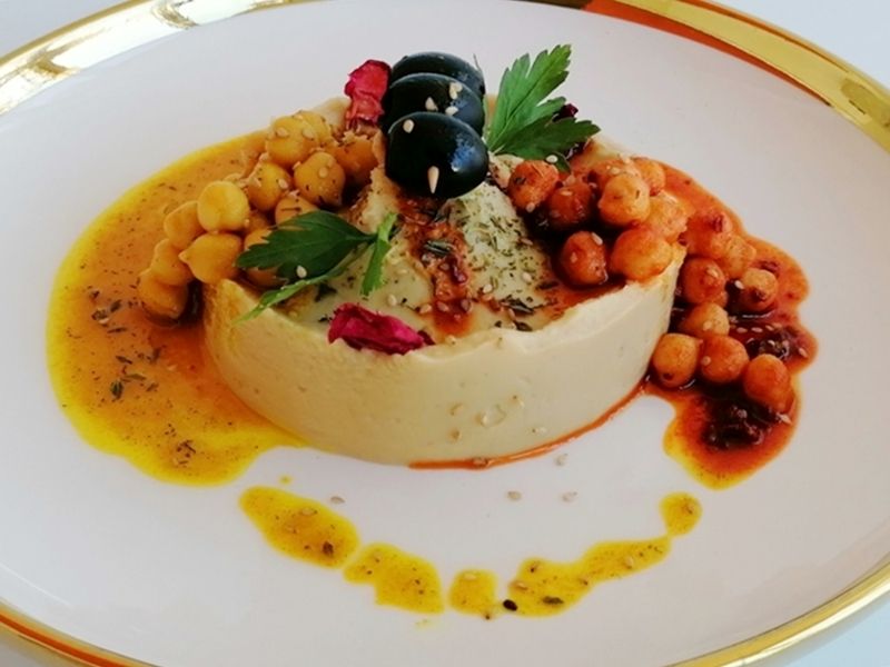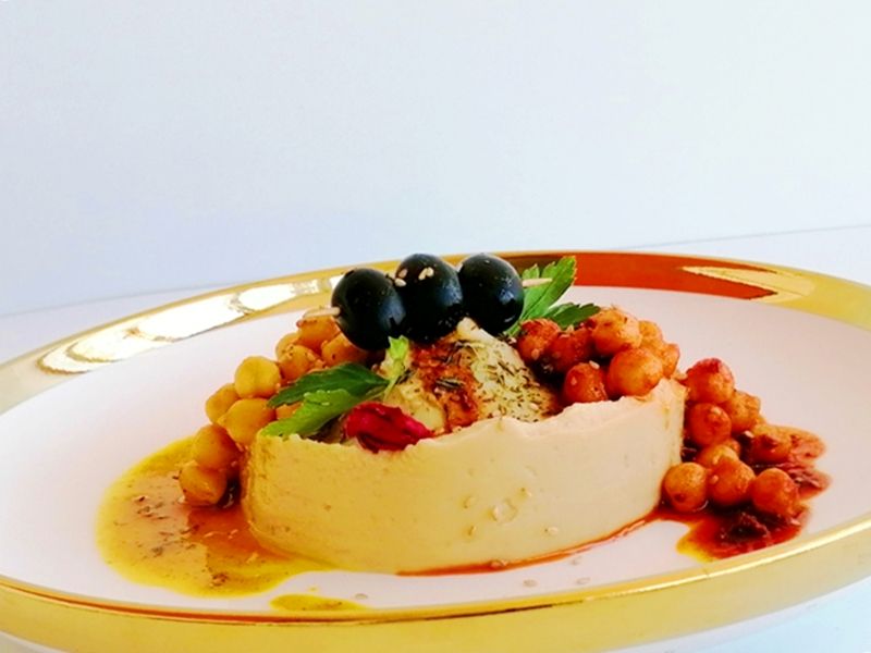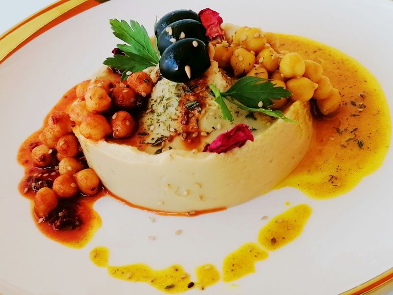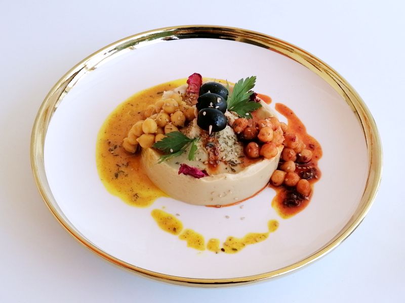 Eine köstliche, orientalische, cremige, kalte Vorspeise aus gekochten und pürierten Kichererbsen, verfeinert mit Sesampüree (Tahini) , Zitronensaft, Knoblauch und Bio-Gewürzen.