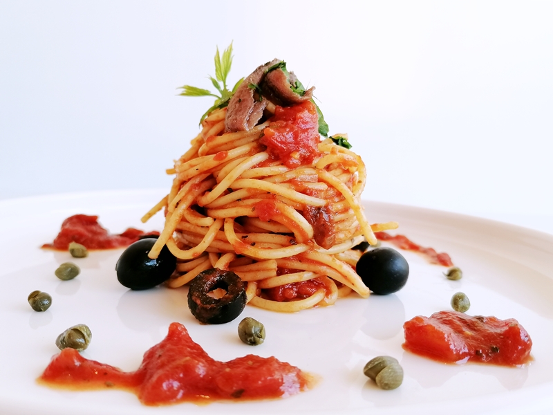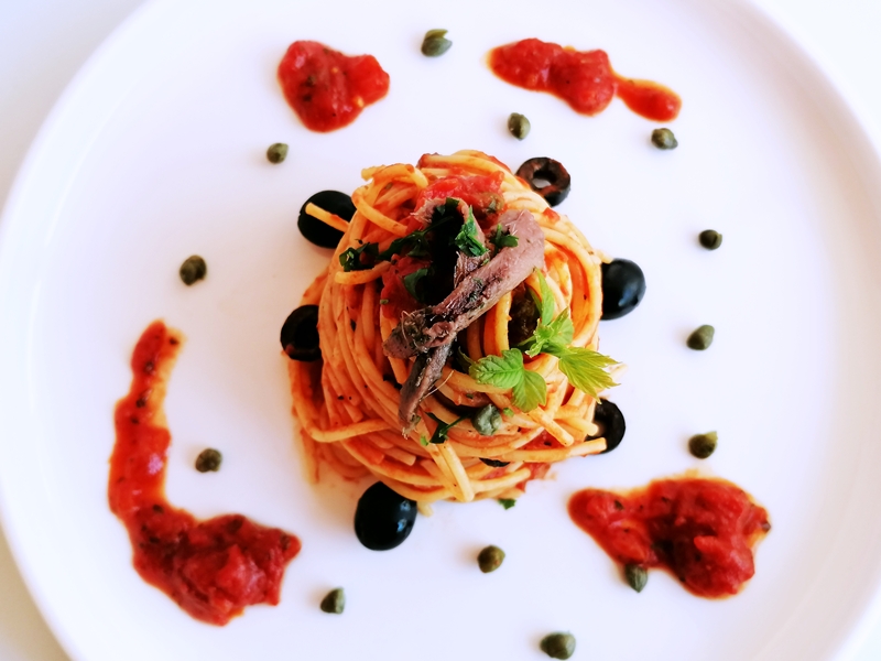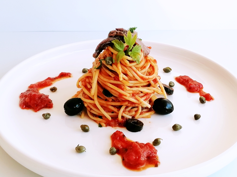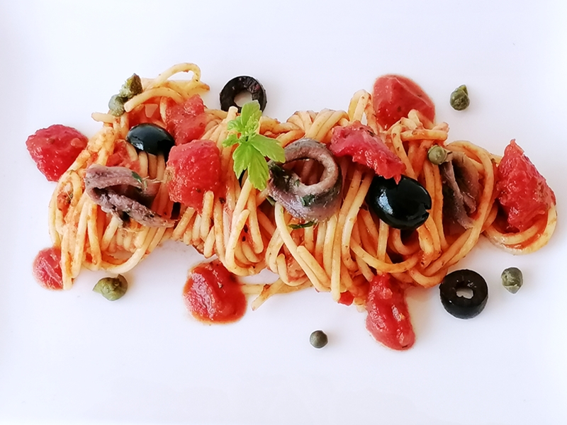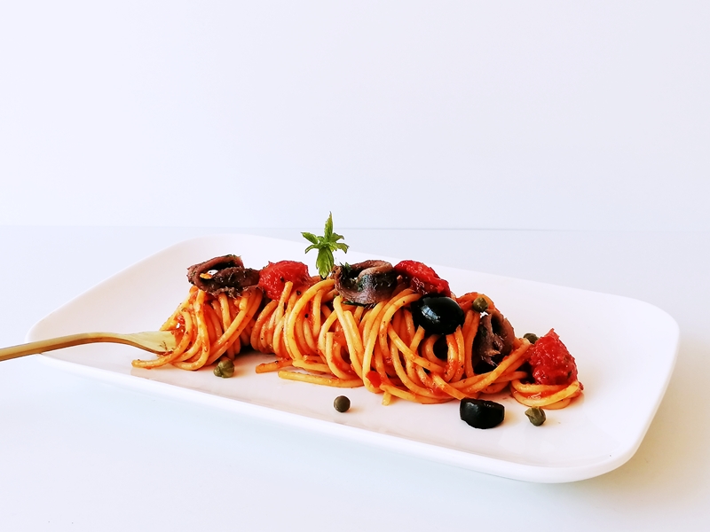 Klassische, einfache und köstliche Nudelgericht aus Napoli, sie besteht aus Tomaten, Oliven Kapern, Knoblauch, Sardellen und Olivenöl.